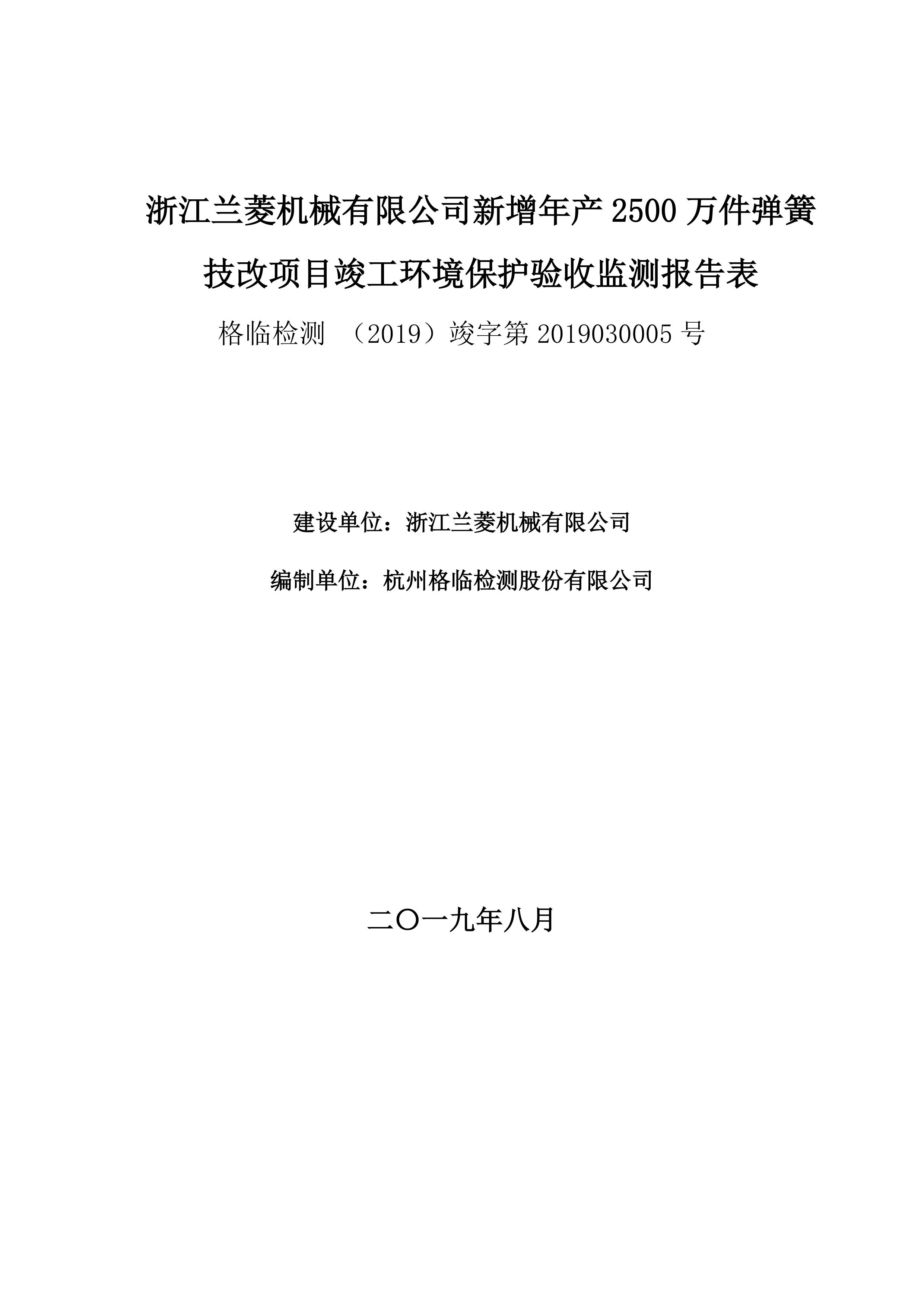 委托書號181301竣字2019030005號浙江蘭菱機械有限公司新增年產2500萬件彈簧技改項目“三同時”竣工環境保護驗收監測報告表